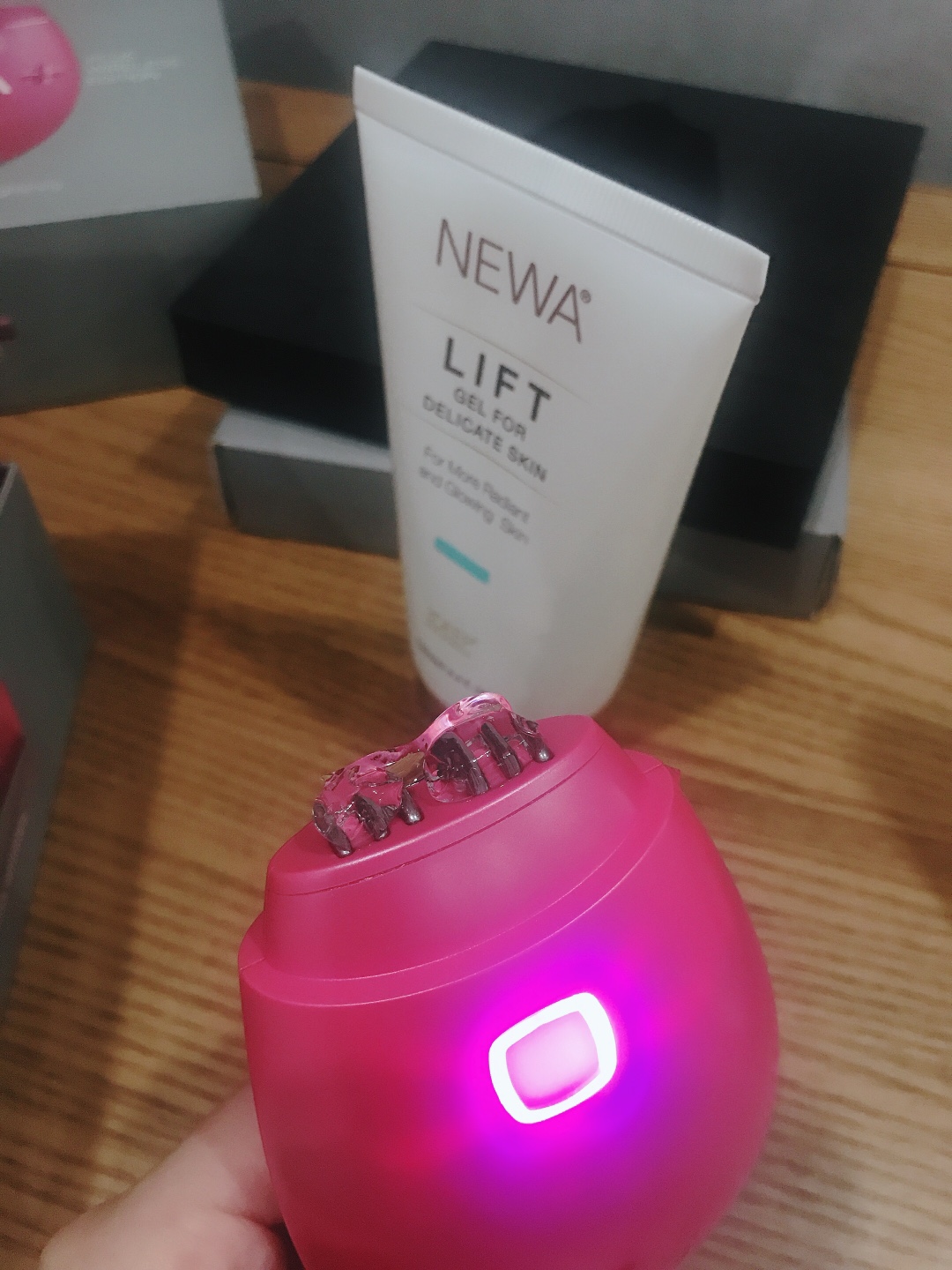 收到就迫不及待的使用了提拉效果明显会坚持用下去,用了一个月左右,也没具体去对比,觉得每次用完都蛮舒服的,热热的再敷一片面膜,第二天皮肤状态不错,还没用,但是做了功课才买相信坚持柜好吧,今天刚开始用每边脸上下两次,算了一下时间16分钟可以按完两边可以接受,按完后脸上有些热热的感觉血液循环加速照了一下镜子发现气色会红润了不错,擦完凝胶再涂护肤品发现护肤品很好吸收,应该是个不错的仪器,准备隔天就使用一次3个月后期待更多的惊喜紧致提升的效果……