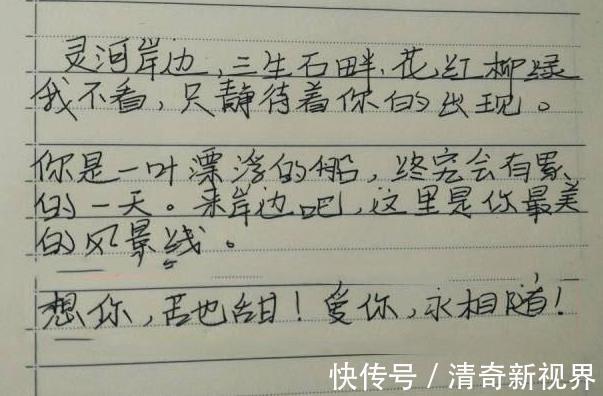 “灵河岸边,三生石畔,花红柳绿我不看,只静待你的出现。”看看这句话,虽然兜妈嗅到了“舔狗”的气息,但人家学霸也是一位才华横溢的“舔狗”!“想你,苦也甜!爱你,永相随!”短短几句话,不过百余字,华丽的词藻配上深情的话语,按照《亮剑》中李云龙的话讲,“就算是块石头压在我李云龙的胸口,这会儿也该捂热了。”相信,这位语文学霸一定会抱得爱人归!