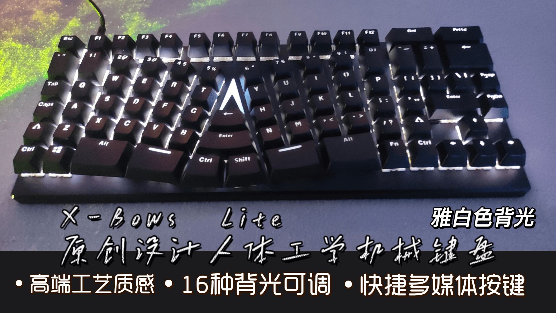 好了最后来赏析一下键盘上的其他亮点 。 我称呼它为键盘王国的键骑士与红轴干将 , 他们的排列就像士兵正在等待他们的司令发号司令一般严正以待全线出征的背光 。 只要一按就会激活整个键盘的灵魂 。 这就是X-Bows人体工学机械键盘带给我的全面感受 。 舒适 , 聚合 , 炫酷带有灵魂的这么一款人体工学机械键盘 。