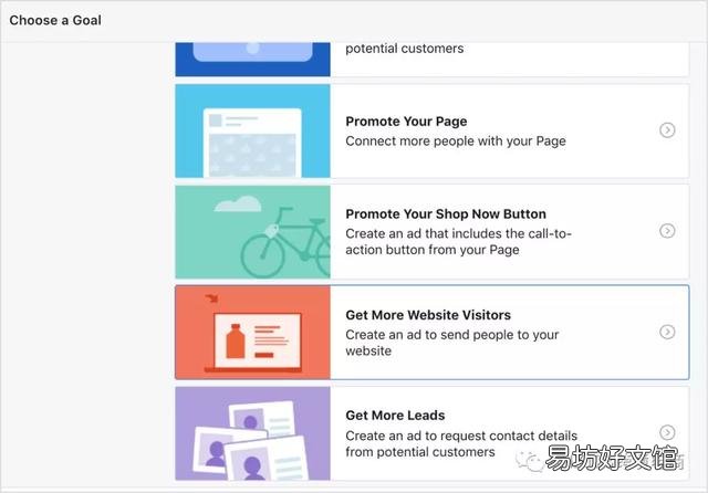 要创建Facebook广告系列 , 并引流到用户开发页面 , 你需要向下滚动目标列表 , 然后选择“Get More Website Visitors”: